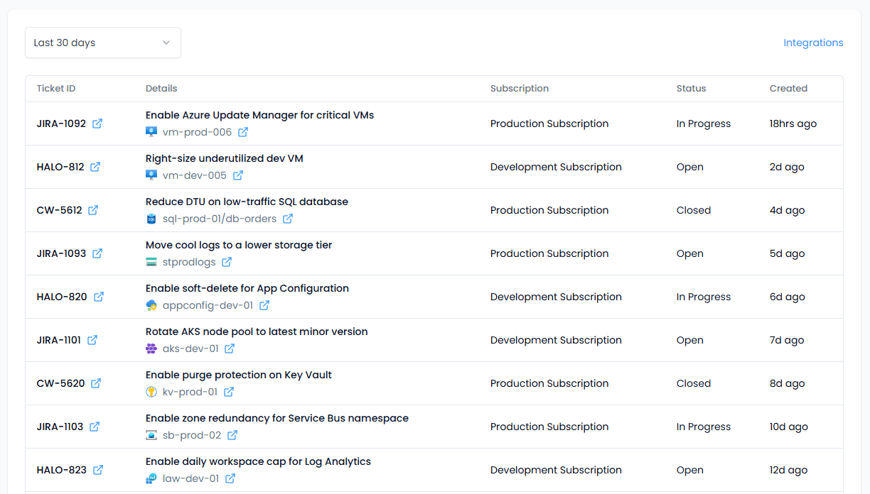 The Tickets page shows every ticket Spotto creates when you share a recommendation to a ticketing provider (Jira, Halo, or ConnectWise). It gives you a single place to confirm creation, review context, and jump back to the provider or the original recommendation.